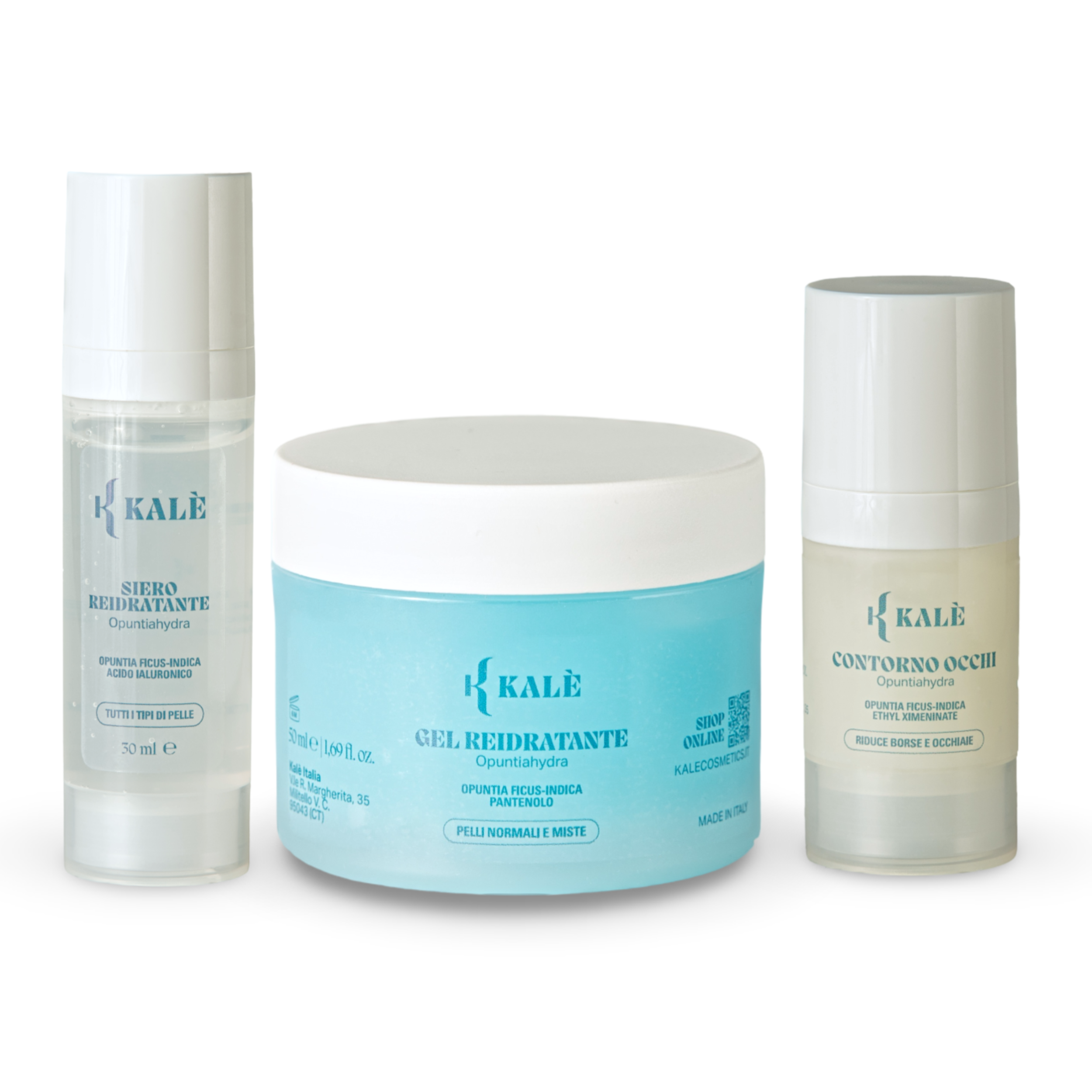 Il Kit Viso Illuminante Pelli Miste è nato esattamente per questo: tre prodotti selezionati per lavorare in sinergia sulle esigenze specifiche della pelle mista, con la leggerezza delle texture Kalè e la forza dell’Opuntia Ficus Indica siciliana.